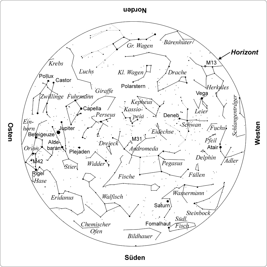 - Astronomie im Berchtesgadener Land - Der Sternenhimmel im November 2024![]() Die abgebildete Sternkarte ist für den 15. November um 21 Uhr MEZ erstellt und zeigt den Sternenhimmel entsprechend am Monatsanfang rund eine Stunde später sowie am Monatsende ca. eine Stunde früher. M31 stellt die Andromeda-Galaxie dar, die hellste Galaxie am nördlichen Himmel und die einzige ihrer Art, die bei uns mit bloßem Auge beobachtet werden kann. Bei M13 handelt es sich um den lichtstärksten Kugelsternhaufen am Nordhimmel, bei M42 um den bekannten Orionnebel im "Schwertgehänge" des Sternbilds Orion. Wenn sie hoch genug über dem Horizont stehen (bei M13 nur in den frühen und bei M42 ab den späteren Abendstunden), sind alle schöne Feldstecher-Objekte; M31 und M42 sind nach Adaption an die Dunkelheit leicht ohne Hilfsmittel sichtbar, bei M13 gelingt dies nur unter exzellenten Bedingungen. Bzgl. Jupiter und Saturn vgl. den Text. Otto Pilzer [Zum Vergrößern bitte Bild anklicken] Die länger werdenden Nächte im Herbst laden zur Beobachtung unseres Sternenhimmels ein, da auch die Temperaturen meist noch nicht ungemütlich tief sind. Nach einem kurzen Exkurs zu den Planeten wollen wir uns diesmal besonders der Orientierung am Himmel und den Sternbildern zuwenden. Der innerste Planet Merkur bleibt unsichtbar und die helle Venus verbessert ihre Abendsichtbarkeit. Der sich seiner Opposition Anfang nächsten Jahres nähernde rote Nachbar Mars entwickelt sich zunehmend zum Planeten der ganzen Nacht, ähnliches gilt für den hellen Jupiter, der seiner Opposition im Dezember entgegenstrebt. Der Saturn (Opposition im September) mit seinem derzeit nur schmal erscheinenden Ringsystem ist noch in der ersten Nachthälfte sichtbar. Der Uranus erreicht seine Opposition in der Monatsmitte und ist mit einer Helligkeit von 5,6 mag dann ein schönes Feldstecherobjekt (theroretisch sogar mit bloßem Auge sichtbar). Den Neptun (Opposition ebenfalls im September) kann man hingegen nur bis gegen Mitternacht erspähen und es empfiehlt sich ein kleines Teleskop. Für Uranus und Neptun finden sich Aufsuchkarten im Internet. Noch eine Erkärung zur diesen Monat fast inflationär genannten Opposition: In dieser Position befindet sich ein Planet von der Erde aus gesehen genau auf der anderen Seite wie die Sonne. Der Vorteil ist, dass der Wandelstern dann in Erdnähe während der ganzen Nacht besonders groß und damit hell ist - ideal zur Beobachtung. Selbst mit Hilfe einer Sternkarte wie der abgebildeten tut man sich ohne Erfahrung beim Aufsuchen der Objekte am Nachthimmel schwer. Daher haben sich die Astronomen ein paar Tricks überlegt. Einer davon ist, die jeweils hellsten bzw. auffälligsten Sterne der Jahreszeiten, die eine einfache geometrische Figur ergeben, zur Orientierung zu nutzen. Im Sommer bilden Vega in der Leier, Deneb im Schwan und Atair im Adler das Sommerdreieck, das noch über dem Westhorizont steht, aber jetzt im Laufe der Nacht bis auf den zirkumpolaren Deneb untergeht. Im Herbst steht das Pegasus-Quadrat, auch als Herbstviereck bezeichnet, wie derzeit in Südrichtung hoch am Himmel. Der dem Zenit nächste Stern gehört dabei eigentlich schon zum Sternbild Andromeda. Geht man von diesem Stern zwei Sterne weiter nach Osten (also links) sowie dann zwei schwächere Sterne nach oben, kann man bei guter Adaption etwas rechts oberhalb die Andromedagalaxie M31 als diffusen Fleck erkennen. Dazu ein Tipp für die Beobachtung lichtschwacher Objekte - egal ob mit oder ohne optische Hilfsmittel: Aufgrund der Anatomie des Auges empfiehlt es sich, dabei nicht genau in Richtung z.B. unserer Nachbargalaxie M31 zu blicken, sondern absichtlich daneben zu sehen - die Astromomen nennen dies "indirektes Sehen". In der Mitte des Auges, also dem "Gelben Fleck" mit seinen Zapfen, sehen wir zwar Farben, diese Zellen sind aber relativ lichtunempfindlich. Außen herum sehen wir mittels der Stäbchen zwar nur schwarzweiß, dafür sind die Augen dort aber lichtempfindlicher! Im Winter ergänzen sich am Osthorizont Pollux in den Zwillingen (leicht identifizierbar durch den fast gleich hellen Castor ganz in der Nähe), Capella im Fuhrmann, Aldebaran im Stier, Rigel im Orion, Sirius im Großen Hund sowie Prokyon im Kleinen Hund zum Wintersechseck. Die letzten beiden Sterne befinden sich auf der abgebildeten Karte noch unter dem Horizont. Beteigeuze, der rötliche hellste Stern innerhalb des Sechsecks, die linke Schulter des Helden Orion, bildet zusammen mit Sirius und Prokyon das Winterdreieck. Zum Sier gehört ein bekannter offener Sternhaufen, die Plejaden M45, die auch unter der Bezeichnung Siebengestirn bekannt sind. Dieser Name erklärt sich dadurch, dass man mit guten Augen typischerweise sieben der insgesamt einigen Hundert Sterne auflösen kann. Kinder mit ihren besseren Augen können teilweise viel mehr einzelne Sterne identifizieren, die sie entsprechend korrekt malen konnten. Der Vollständigkeit halber sei hier auch noch das Frühlingsdreieck erwähnt, das sich aus Regulus im Löwen, Spica in der Jungfrau und Arktur im Bootes oder Bärenhüter zusammensetzt. Wenn man sich damit am Himmel orientiert hat, lassen sich die Sternbilder drumherum meist leicht zuordnen. Zusätzlich kann die einprägsame Form von Sternbildern eine Hilfe sein, ein Paradebeispiel ist die Kassiopeia, die auch als Himmels-W bezeichnet wird - zu finden fast im Zenit zwischen Andromeda und dem Polarstern. Apropos Polaris, der in der Verlängerung der Erdachse am Himmel steht und die Nordrichtung anzeigt, diesen Stern findet man am einfachsten, wenn man die Hinterachse des momentan am Nordhorizont entlang fahrenden Großen Wagens um ca. den Faktor fünf nach oben verlängert. Der Meteorstrom des Monats sind die Leoniden, die ab der Monatsmitte aus dem Sternbild Löwe zu kommen scheinen und sehr schnelle Objekte sind. Leider variieren die Fallraten stark, daher hoffen wir einfach auf ein gutes Jahr. Bedauerlicherweise wird der Mond die Beobachtung beeint