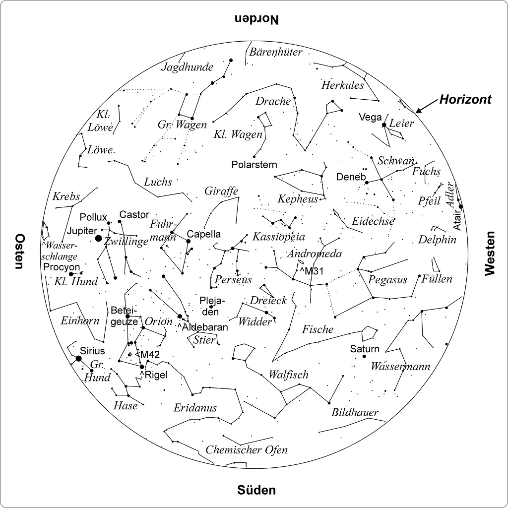 - Astronomie im Berchtesgadener Land - Der Sternenhimmel im Dezember 2025![]() Die abgebildete Sternkarte ist für den 15. Dezember um 21 Uhr MEZ erstellt und bildet den Sternenhimmel entsprechend am Monatsanfang rund eine Stunde später sowie am Monatsende ca. eine Stunde früher ab. Die Andromedagalaxie M31 sowie der Orionnebel M42 im "Schwertgehänge" des Sternbilds Orion sollten nach guter Adaption an die Dunkelheit an Beobachtungsorten ohne Streulicht leicht mit bloßem Auge als "diffuse Flecken" sichtbar sein. Bzgl. Jupiter, Saturn und mehr zu M31 vgl. den Text. Otto Pilzer [Zum Vergrößern bitte Bild anklicken] Da der richtige, kalte Winter bei uns meistens erst im Januar und Februar kommt, können wir hoffen, einige der langen Dezembernächte bei klarem Himmel und einigermaßen erträglichen Temperaturen zu genießen. Die Sonnenaufgangszeit verlagert sich von 7:37 zu Anfang auf 7:58 am Ende des Monats, während die Sonnenuntergangszeit sich nur von 16:18 auf 16:25 verschiebt. Dazwischen liegt der 21. Dezember, der kürzeste Tag unseres Jahres, an dem die Sonne genau senkrecht über dem südlichen Wendekreis steht und bei uns nur 18°38' über den Horizont steigt. Dieser Tag ist für uns der Winterbeginn. Der Monat beginnt mit zunehmendem Mond und schon am 5. Dezember ist Vollmond. Wie am 5. November handelt es sich wieder um einen "Supermond", da er "nur" 364.192 km von der Erde entfernt ist. Dadurch erscheint er 7,9% größer und 15% heller als ein normaler Vollmond. Bereits in der späten Nacht vom 4. Dezember zieht unser Begleiter an den Plejaden vorbei. Am Abend des 7. Dezembers bietet sich im Osten eine interessante Konstellation, in der er neben Saturn und unterhalb der Zwillingssterne Castor und Pollux steht. Neumond ist dann am 20. Dezember. Venus hat sich vom Morgenhimmel zurückgezogen und nähert sich der oberen Konjunktion mit der Sonne, aber Merkur (-0,1 bis -0,38 mag) ist fast den ganzen Monat am Morgen tief im Osten sichtbar. Mars bleibt unsichtbar, er nähert sich der Konjunktion zur Sonne. Jupiter (-2,3 mag) in den Zwillingen ist ein Objekt der ganzen Nacht. Er bildet mit den Sternen Castor und Pollux ein auffälliges Dreigestirn. Wer ein Fernglas oder Fernrohr zur Hand hat, kann um Mitternacht vom 10. auf den 11. Dezember beobachten, wie sich alle vier Galileischen Monde auf der einen Seite des Jupiters versammeln. In der ersten Nachthälfte lässt sich Saturn (1,2 mag) im Wassermann gut beobachten. Mit einem guten Fernglas kann man auch Uranus (5,8 mag) im Stier, südwestlich der Plejaden, genau auf der Ekliptik finden. Abends kann man sich im Westen von den Sommersternbildern Schwan, Leier und Adler verabschieden. Unterhalb des markanten Herbstvierecks aus Sternen von Pegasus und Andromeda finden wir die unauffälligeren Sternbilder Fische, Wassermann, Walfisch und Eridanus. Um 22 Uhr sind dann die klassischen Wintersternbilder Orion, Stier, Fuhrmann und Zwillinge voll im Bild. Ein guter Anhaltspunkt sind die drei Gürtelsterne des Orion Alnitak, Alnilam und Mintaka (von links). Von Alnitak nach unten leuchtet ein heller Streifen: Das Schwert des Orion. Dazu gehören mehrere Sterne und Nebel, deren prominentester der Große Orionnebel M 42 (3,7 mag), ein Emissionsnebel, ist. Er besteht überwiegend aus Wasserstoff und ist ein Sternentstehungsgebiet. Die entstehenden Sterne lassen durch ihre ionisierende Strahlung den Nebel im sichtbaren Licht leuchten. Da der Nebel mit einer Entfernung von 1.350 Lichtjahren relativ nah ist, wird daran zur Entstehung von Sternen geforscht. In seinem Zentrum liegt das Trapez, vier Sterne, die ein trapezförmiges Viereck bilden (theta1 A, B, C und D). Das Trapez ist als heller Stern (4,56 mag) mit bloßem Auge zu erkennen. Um die vier Trapezsterne einzeln zu beobachten, braucht man ein gutes Fernglas oder ein Fernrohr. Die Trapezsterne sind mit einem Alter von 1 bis 2,5 Millionen Jahren sehr jung und bestehen jeweils aus verschiedenen Komponenten. Ihre Strahlung macht den Orionnebel zu einem herausragenden Objekt. In diesem Jahr ist die Beobachtung der beiden Dezember-Sternschnuppenströme günstig, da der Mond die Suche nicht stört. Es sind die Geminiden vom 7. bis 17. (ein besonders reicher Strom) und die Ursiden vom 17. bis zum 26. Dezember. Der Höhepunkt der Geminiden wird in der Nacht vom 13. auf den 14. Dezember erreicht. Unter idealen Bedingungen können bis zu 150 Meteore pro Stunde beobachtet werden. Die Beobachtungsbedingungen werden in diesem Jahr günstig sein, da sich der Mond in der Phase der abnehmenden Mondsichel befindet. Die Geminiden scheinen aus dem Sternbild Zwillinge in der Nähe des hellen Sterns Castor zu strahlen. Man muss aber nicht direkt auf das Sternbild Zwillinge schauen - besser ist es, ein wenig abseits zu blicken, um die Meteore mit den längeren Schweifen zu sehen. Ihre Fallrate nimmt bis 2 Uhr morgens Ortszeit zu. Zu dieser Zeit steht der Radiant am höchsten am Himmel und die Aktivität der Geminiden ist am stärksten. Die Geminiden sind Trümmer des Asteroiden 3200 Phaethon. Dieser Asteroid ist ein riesiger Felsbrocken mit einem Durchmesser von etwa 6 km, benannt nach dem griechischen Mythos von Phaethon, dem Sohn des Sonnengottes Helios. Die Umlaufbahn von 3200 Phaethon ist sehr lang gestreckt und erinnert an die Umlaufbahn einiger Kometen. Phaethon umkreist die Sonne alle 1,4 Jahre und hinterlässt dabei eine Spur von Trümmern. Im Jahr 2025 erreicht der Ursiden-Meteorschauer in der Nacht vom 21. auf den 22. Dezember mit maximal 10 Meteoren pro Stunde seinen Höhepunkt. Ihr Mutterkörper ist der periodische Komet 8P/Tuttle. Auch sie werden vom Mondlicht nicht beeinträchtigt. Gerardo Inhester