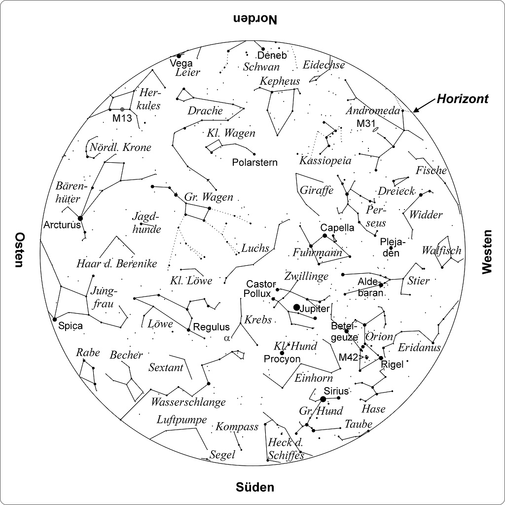 - Astronomie im Berchtesgadener Land - Der Sternenhimmel im März 2026![]() Die abgebildete Sternkarte ist für den 15. März um 21 Uhr MEZ erstellt und zeigt den Sternenhimmel entsprechend am Monatsanfang rund eine Stunde später sowie am Monatsende ca. eine Stunde früher bzw. ab der Sommerzeit damit wieder gegen 21 Uhr MESZ. Bei M13 handelt es sich um den hellsten Kugelsternhaufen am nördlichen Himmel, bei M31 um die Andromedagalaxie, die auffälligste Galaxie am Nordhimmel, und bei M42 um den bekannten Orionnebel im "Schwertgehänge" des Sternbilds Orion. Wenn sie hoch genug über dem Horizont stehen, sind alle schöne Feldstecher-Objekte; M31 und M42 sind am früheren Abend nach Adaption an die Dunkelheit leicht mit bloßem Auge sichtbar, bei M13 gelingt dies ab dem späteren Abend nur unter sehr guten Bedingungen. Bzgl. Jupiter vgl. den Text. Otto Pilzer [Zum Vergrößern bitte Bild anklicken] Der Monat beginnt mit dem meteorologischen Frühlingsanfang am 1. März. Knapp drei Wochen später am 20. folgt ihm der astronomische Frühlingsbeginn. Dieser ist nicht an ein exaktes Datum geknüpft, sondern kann um einzelne Tage nach vorne oder hinten wandern. Zeitpunktbestimmend ist das Überqueren des Himmelsäquators durch die Sonne auf ihrem Weg nach Norden. Weil die Sonne an diesem Tag genau am Äquator steht, haben wir Tag- und Nachtgleiche, und sie hält sich jeweils zwölf Stunden über sowie unter dem Horizont auf. Am 29. (letzter März-Sonntag) stellen wir unsere Uhren wieder auf Sommerzeit um. Die drei Planeten Merkur, Mars und Saturn bleiben in diesem Monat unsichtbar. Auch die knapp -4 mag helle Venus gewinnt nur langsam an Sichtbarkeit. Anfang des Monats geht sie um 19:10 unter, das ist ungefähr zum Ende der Dämmerung. Zum Monatsende versinkt sie um 20:30 (= 21:30 MESZ) am Horizont. Da sich im Laufe des Monats auch die Dämmerung um 50 min nach hinten schiebt, bleibt also nur eine halbe Stunde mehr zur Beobachtung der Venus. Sie befindet sich momentan weit hinter der Sonne, so dass ihr Durchmesser nur zehn Bogensekunden beträgt und ihr Planetenscheibchen im Teleskop kreisrund erscheint. Am 8. zieht sie in nur 1° Abstand nördlich an Saturn vorbei und am 20. kommt es zu einer reizvollen Begegnung mit der sehr schmalen Mondsichel (40 Std. seit Neumond). Jupiter bleibt weiterhin der Star der Nacht. Da er jetzt am Nachmittag aufgeht (unbeobachtbar), erreicht er schon am frühen Abend große Höhen und ist damit in der ersten Nachthälfte optimal zu beobachten. Mit -2,3 mag dominiert er den Nachthimmel bis zu seinem Untergang, der knapp zwei Stunden vor Beginn der Morgendämmerung eintritt. Mit einem guten höher vergrößernden Fernglas kann man ihm schon erste Details entlocken - nämlich seine vier hellen Begleiter, die Galileischen Monde. Freilich müssen sie deutlichen Abstand haben, um von ihm nicht überstrahlt zu werden. Die hohe Vergrößerung in einem Teleskop ermöglicht uns hingegen, verschiedene Szenarien der Mondbewegung genau mitzuverfolgen. Ein vor Jupiter stehender Mond kann vor dem Planetenscheibchen durchwandern (sog. Durchgang) und sein Schatten kann auf Jupiter fallen (Sonnenfinsternis auf Jupiter). Ein Mond wird unsichtbar, wenn er sich direkt hinter Jupiter aufhält (sog. Bedeckung) oder Jupiters Schatten auf ihn fällt (Sonnenfinsternis auf ganzem Mond). Diese Ereignisse treten sehr häufig auf, weil die Umlaufzeiten der Jupitermonde mit etwa zwei bis 16 Tagen recht kurz sind. Ihre Zeitpunkte sind vorherberechnet und können Jahrbüchern entnommen werden. Aber das ist noch nicht alles. Schon in einem kleinen Fernrohr werden zwei Wolkenbänder in Jupiters Atmosphäre greifbar. Mit etwas mehr Öffnung kommen der Große Rote Fleck und weitere Strukturen seiner Atmosphäre zum Vorschein. Der Winter neigt sich dem Ende zu, das wird auch am Sternenhimmel deutlich. In Kürze ist das Wintersechseck nicht mehr vollzählig, weil zuerst Rigel und dann Sirius sowie Aldebaran untergehen. Auf unserer Sternkarte hat der Krebs seine Kulmination fast vollendet und das klassische Frühlingssternbild Löwe steht zur Ablösung bereit. Nördlich davon haben Kleiner Löwe und Großer Bär auch schon den Südmeridian angetastet und der unscheinbare Luchs hat ihn bereits überschritten. Der Krebs ist ein Übergangssternbild, mit dem der Winter- in den Frühlingshimmel übergeht. In der Sternkarte wird es als auf dem Kopf stehendes Y dargestellt. Vom Zentralstern weg gehen drei Zweige zu anderen Sternen, von denen aber keiner heller als 3,5 mag ist. Somit würde es sich eher um ein unscheinbares Sternbild handeln, wenn da nicht noch was anderes wäre, das für Bekanntheit sorgt. In seinem Zentrum beherbergt es die Krippe (lat. Präsepe, M 44), einen 3 mag hellen offenen Sternhaufen, der schon mit bloßem Auge als nebeliger Fleck erkennbar ist. Auch im Altertum war er als "wolkiger Stern" bekannt. Ein Fernglas beliebiger Größe löst den Nebel in Einzelsterne (ab 6,5 mag) auf und das große Bildfeld lässt genügend dunkles Umfeld übrig, um den prachtvollen Sternhaufen voll zur Geltung zu bringen. Es werden etwa 30 bis 50 Sterne sichtbar, von denen die hellsten ein nach Osten geöffnetes V bilden. Im Teleskop sollte die Vergrößerung möglichst gering gewählt werden, da sein Durchmesser von über einem Grad sonst das Bildfeld sprengt. Ein Teleskop unbedingt zu empfehlen ist für den offenen Sternhaufen M 67, der sich zwei Grad rechts des Sterns Alpha befindet (das ist der Zielstern des südöstlichen Y-Zweiges). Die Helligkeit des Nebels als auch seiner Einzelsterne ist um 3 bis 4 mag geringer als bei M 44, so dass im Feldstecher nur ein schwaches Leuchten erkennbar wird. Mit nur einem Viertel des Durchmessers konzentrieren sich seine mehr als 100 Mitglieder auf einen deutlich engeren Raum und er ist mit 2500 LJ auch viermal so weit entfernt wie die Krippe - ein echter Kontrast an sich ähnlicher Objekte. Nachdem das Teleskop schon aufgebaut ist, kann man noch eine andere Ob