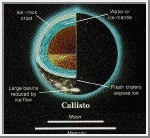 Callisto has the lowest density (1.86 gm/cm3) of the Galilean satellites. The moon is probably made of a large rocky core surrounded by water and ice, giving it a dark color. It is composed of approximately equal proportions of ice-water and rock. Meteorites have punctured holes in the crust, causing water to spread over the surface and forming bright rays and rings around the crater. Callisto has no known atmosphere.