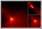 The left image is 2070 miles across (3340 km) and shows that most of the dust is being produced on the sunward-facing hemisphere of the comet. Also at upper left are three small pieces which have broken off the comet and are forming their own tails. Icy regions on the nucleus are activated as they rotate into sunlight, ejecting large amounts of dust in the jets that are faintly visible in this image. Sunlight striking this dust eventually turns it around and "blows" it into the tailward hemisphere.