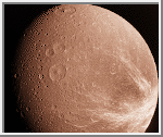 Dione [dy-OH-nee] was discovered in 1684 by Giovanni Cassini. It is an icy body similar to Tethys and Rhea. Its density is 1.43 gm/cm3, which makes it the densest moon of Saturn other than Titan. Dione is probably composed of a rocky core making up one-third of the moon's mass, with the rest water-ice. Its ice coverage is less than that of Tethys and Rhea.
