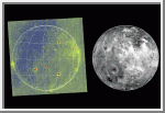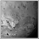 It is interesting to compare this frost distribution with regions of volcanic activity. Volcanic hotspots identified from NIMS and SSI images occur in many of the dark - low SO2 - areas, a reasonable finding since sulfur dioxide would not condense on such hot regions. The Pele region (to the lower left), N. Colchis hot spots (upper center) and S. Volund (upper right) are good examples of hot spot areas depleted in sulfur dioxide. Much of the rest of this hemisphere of Io has varying amounts of sulfur dioxide present. The most sulfur dioxide-rich area is Colchis Regio, the white area to the right of center.