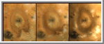 These three views, taken by Galileo in late June 1996, show about 75 percent of Io's surface. The images reveal that some areas on Io are truly red, whereas much of the surface is yellow or light greenish. The major red areas shown here appear to be closely associated with very recent fragmental volcanic deposits (pyroclastics) erupted in the form of volcanic plumes. The most prominent red oval surrounds the volcano Pele (far right), as previously discovered by Hubble Space Telescope images. An intense red spot lies near the active plume Marduk east of Pele. Other reddish areas are associated with known hot spots or regions that have changed substantially since the Voyager spacecraft flybys of 1979. The reddish deposits may be the products of high-temperature explosive volcanism.