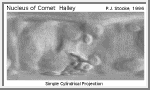 Halley encounter on March 13, 1986. The nucleus dimensions are about 16 by 8 by 8