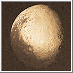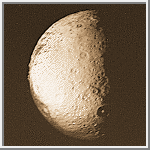 Iapetus [eye-AP-i-tus] is one of the stranger moons of Saturn. Its density is similar to that of Rhea, indicating that it has a small allotment of rocky materials. Its leading side is dark with a slight reddish color while its trailing side is bright. The dark surface might be composed of matter that was either swept up from space or oozed from the moon's interior. The real reason is still unknown. The dark material might be a thin layer of organic material perhaps similar to the complex substances found in the most primitive meteorites. However, there are no bright rimed craters present on the dark hemisphere. If the dark material is thin, it must be constantly renewed since a meteor impact would punch through the layer to reveal brighter surface material.