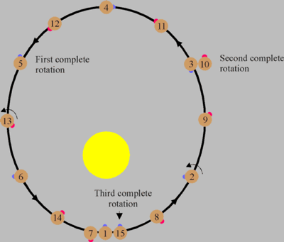 Although Mercury is not tidally locked to the Sun, its rotational period is tidally coupled to its orbital period. Mercury rotates one and a half times during each orbit. Because of this 3:2 resonance, a day on Mercury (sun rise to sun rise) is 176 Earth days long as shown by the following diagram.