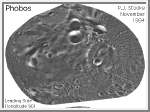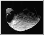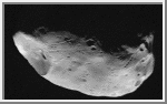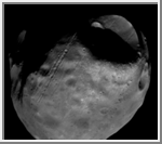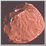 Phobos [FOH-bohs] (fear) is a moon of Mars and was named after an attendant of the Roman war god Mars. Phobos is a dark body that appears to be composed of C-type surface materials. It is similar to the C-type (blackish carbonaceous chondrite) asteroids that exist in the outer asteroid belt. Some scientists speculate that Phobos and Mars' other moon, Deimos, are captured asteroids. However, other scientists point to evidence that contradicts this theory. Phobos shows striated patterns which are probably cracks caused by the impact event of the largest crater on the moon.